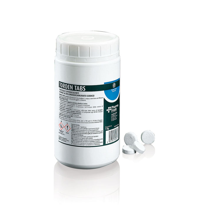 300 Pastiglie effervescenti a base di cloro da 3,4 gr. Azione sanificante e detergente poichè agisce anche sullo sporco rimuovendo le incrostazioni. Elimina gli odori malsani. Barattolo da 1 kg. Lavaggio frutta e vedura 1 pastiglia in 7/8 lt/acqua poi risciacquare. Sanificazione ambienti 1pastiglia in 15/20 lt/acqua. Alternativa al classico Ipoclorito di Sodio. Imballo da 6 barattoli.