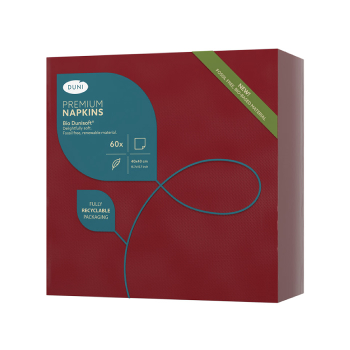 Tovagliolo Bio Dunisoft® 40 x 40 cm Bordeaux. Molto assorbente, dura per tutto il pasto. Rapporto ottimale costo-prestazioni per ambienti informali premium. Generosi per dimensioni, favoriscono il buonumore. Compostabile.
