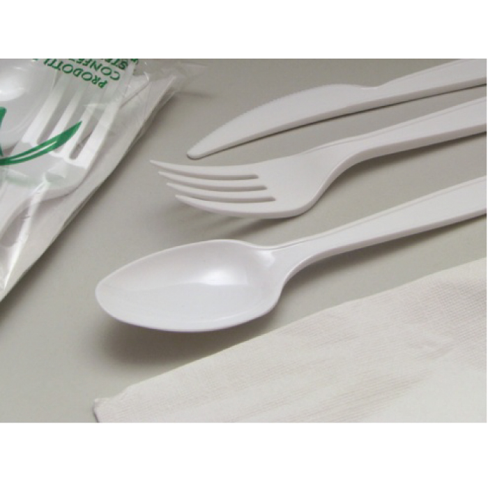 ATTENZIONE: ARTICOLO RIUTILIZZABILE. Tris posate 165 mm bianche gr. 2,5 imbustate + tovagliolo carta 30x30. Prezzo per imballo da 600 pz.