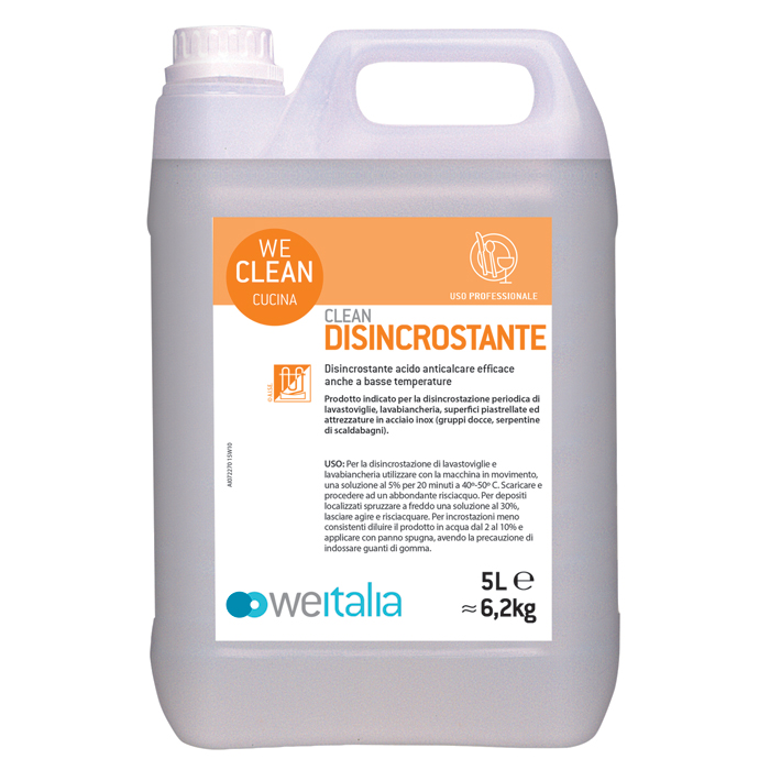 Disincrostante fosfonitrico per lavatrici industriali, lavastoviglie, bolier, scambiatori ecc. Elimina rapidamente tutti i depositi di origine minerale (calcare). Contiene inibitori di corrosione, non aggredisce le superfici con le quali viene a contatto. Non schiumogeno, non contiene ne acido cloridrico ne acido solforico. Produzione DIVERSEY per We Italia. Confezione: tanica 6,2 kg. pari a 5 litri. ATTENZIONE: articolo soggetto a una restrizione o all’obbligo di segnalazione per regolamento UE 2019/1148 relativo all'immissione su mercato e all'uso di precursori esplosivi